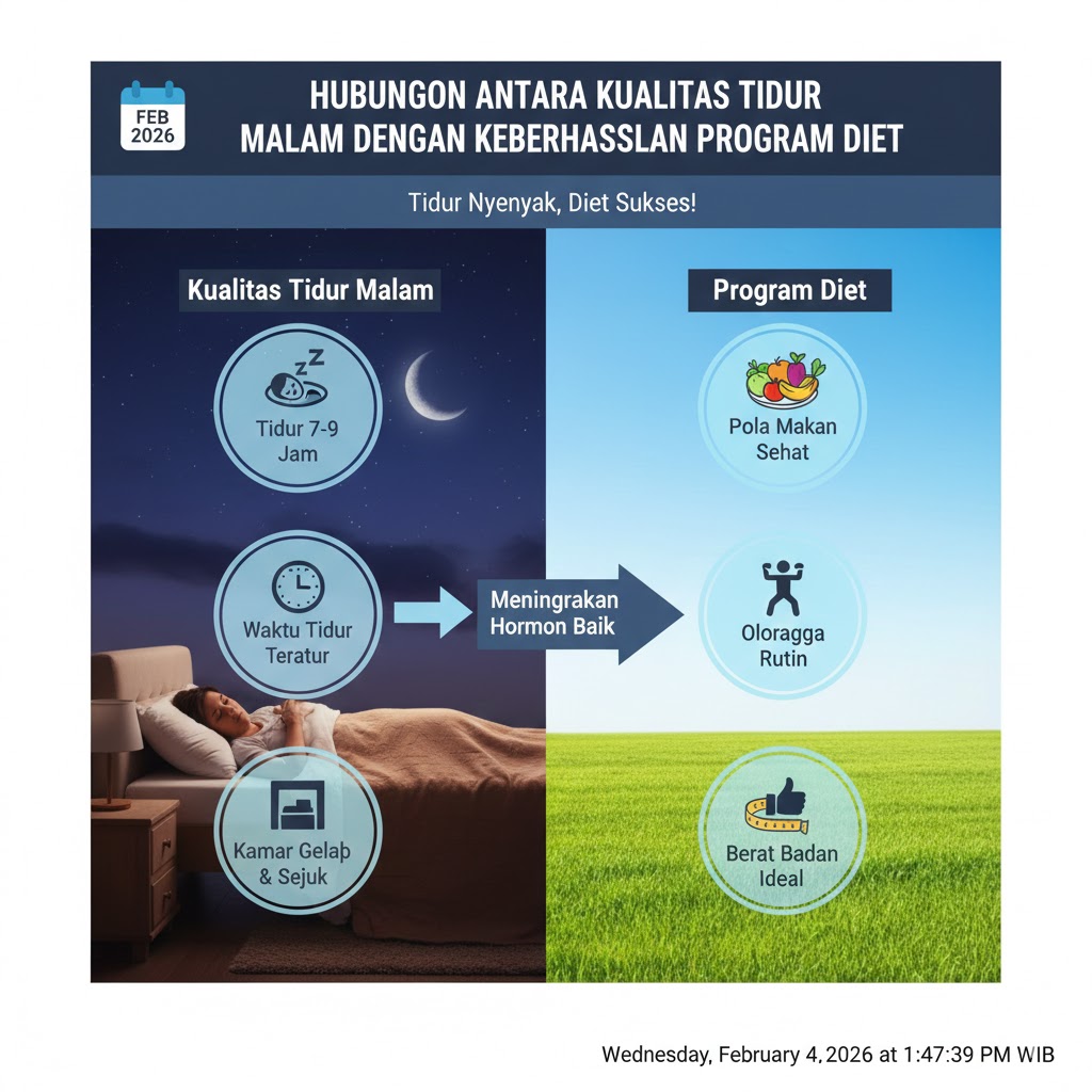 Hubungan antara kualitas tidur malam dan keberhasilan program diet sangat erat dan saling memengaruhi. Tidur yang cukup membantu mengatur hormon, menjaga metabolisme, meningkatkan energi, serta mengontrol stres dan nafsu makan. Tanpa tidur yang berkualitas, usaha diet bisa terasa lebih berat dan hasilnya kurang maksimal. Oleh karena itu, selain mengatur pola makan dan olahraga, memperbaiki kualitas tidur merupakan langkah penting agar program diet yang sedang dijalani dapat memberikan hasil yang optimal dan berkelanjutan.