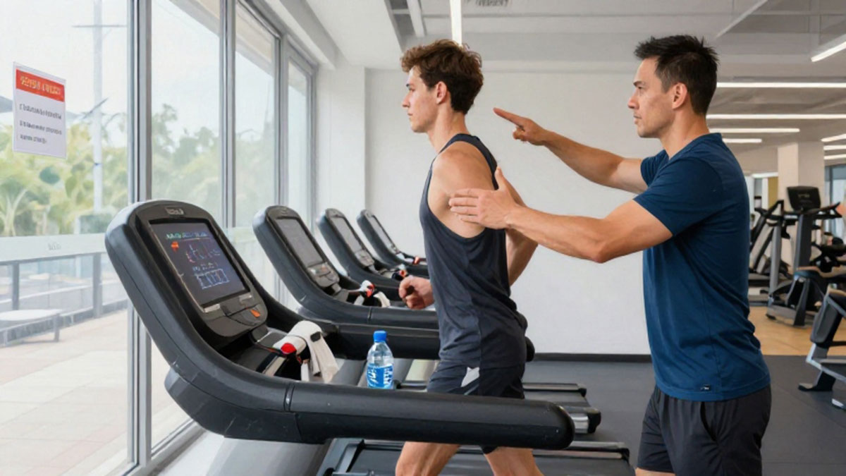 Teknik berlari atau berjalan di treadmill berbeda dengan di lapangan. Pastikan tubuh tetap tegak, bahu rileks, dan pandangan menghadap ke depan. Hindari menunduk atau menatap kaki karena dapat menimbulkan ketegangan pada leher dan punggung. Langkahkan kaki secara alami, jangan terlalu panjang agar tidak cepat lelah, dan gunakan lengan untuk membantu ritme langkah. Pemula dapat memulai latihan dengan berjalan cepat, lalu secara bertahap memasukkan sesi lari pendek. Kombinasi ini membantu meningkatkan stamina dan memperkuat otot kaki serta inti tubuh.